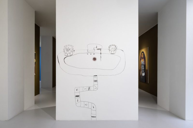 Keep thinking nobody does it like you here comes the sunset è un titolo che suona come una frase sussurrata all’orecchio. E in effetti la mostra ha il tono di una confidenza, Chase suddivide il piano terra della galleria in una sequenza di ambienti domestici: spazi interni privati che ricostruiscono una casa vissuta. Non un set, ma un organismo, le pareti si scuriscono, si colorano, si restringono, il white cube viene piegato e costretto a seguire le curve dei corpi che lo abitano. Nel lavoro di Chase la vita quotidiana diventa riferimento, ed è da lì che parte nella costruzione dei suoi mondi. Il suo immaginario visivo si restringe volontariamente a pochi metri quadrati, ma proprio in questa riduzione si espande. La casa diventa non solo archivio ma specchio: crepe, fili scoperti, tubi che gocciolano, soffitti scrostati, tappeti che trattengono storie. Non c’è nulla di immacolato, gli interventi domestici sembrano lasciati a metà, forse per mancanza di tempo, di soldi o di energia. È una casa reale, dove la comunità si costruisce più per necessità che per estetica.