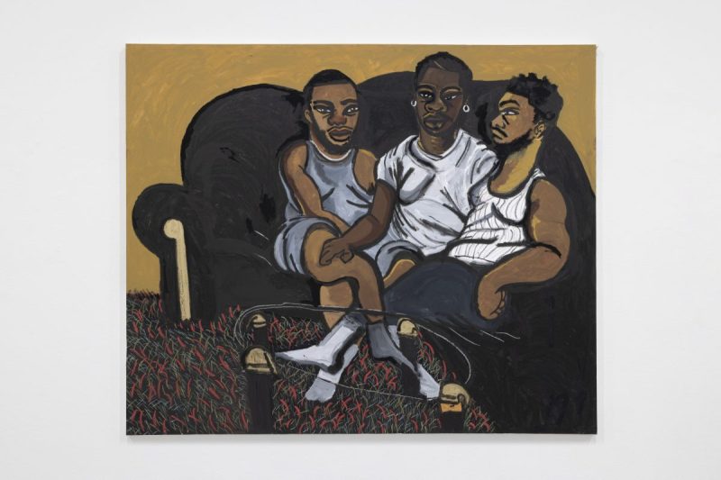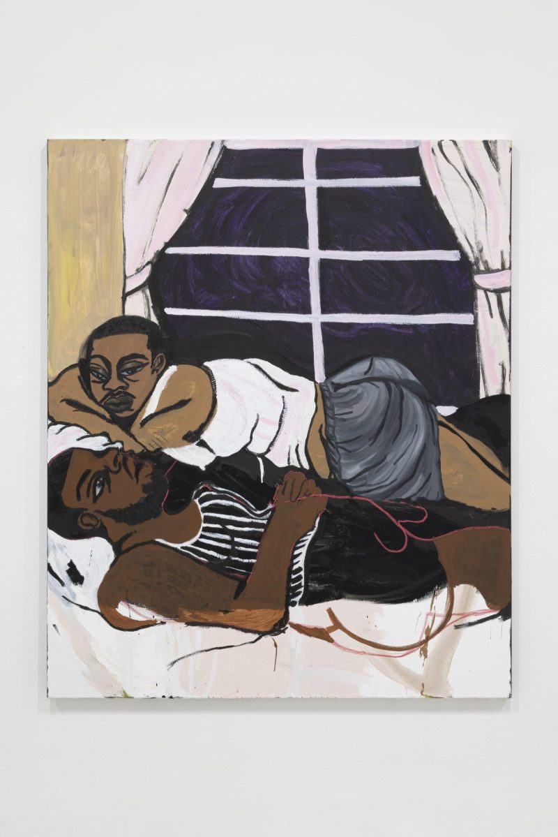 L’intimità che attraversa i suoi lavori non è mai neutra, è presenza, è resistenza. È la rivendicazione di uno spazio – domestico, emotivo, erotico – storicamente negato ai corpi neri queer. Eppure non c’è retorica, le sue figure raramente sono sole: condividono letti, divani, automobili, stanze. La relazione, più che l’individuo, è il nucleo dell’opera. Ci si tiene, ci si guarda, ci si sfiora. La sessualità, quando emerge, è affettuosa, lenta, quasi timida, e più che esibizione è una ricerca di coccole, di un posto sicuro dove poter amare. In questo senso l’erotico non diventa spettacolo ma atmosfera, un gesto trattenuto, una posa che sfida la leggibilità immediata e rifiuta di tradurre l’esperienza in qualcosa di rassicurante o performativo per uno sguardo esterno.